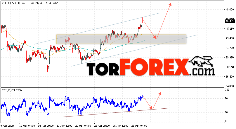 В пользу подъёма котировок LTC/USD выступит тест линии поддержки на индикаторе относительной силы. Вторым сигналом станет отскок от нижней границы восходящего канала. Отменой варианта роста станет падение и пробой области 38.05. Это укажет на пробой области поддержки и ускорение падения курса криптовалюты с потенциальной целью ниже уровня 30.05. С пробоем области сопротивления и закрытием котировок выше уровня 49.05 стоит ожидать подтверждения развития восходящей тенденции по Litecoin.
