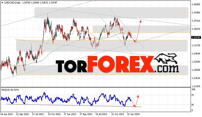 Дополнительным сигналом в пользу роста валютной пары USD/CAD выступит тест бычьей линии тренда на индикаторе относительной силы. Вторым сигналом станет отскок от нижней границы бычьего канала. Отменой варианта роста котировок валютной пары USD/CAD на текущей торговой на неделе 5 — 9 февраля 2024 станет падение и пробой области 1.3065. Это укажет на пробой поддержки и продолжения падения в область ниже уровня 1.2785. Подтверждением росту по паре выступит пробой области сопротивления и закрытие цены над уровнем 1.3605, что укажет на пробой верхней границы медвежьего канала коррекции.