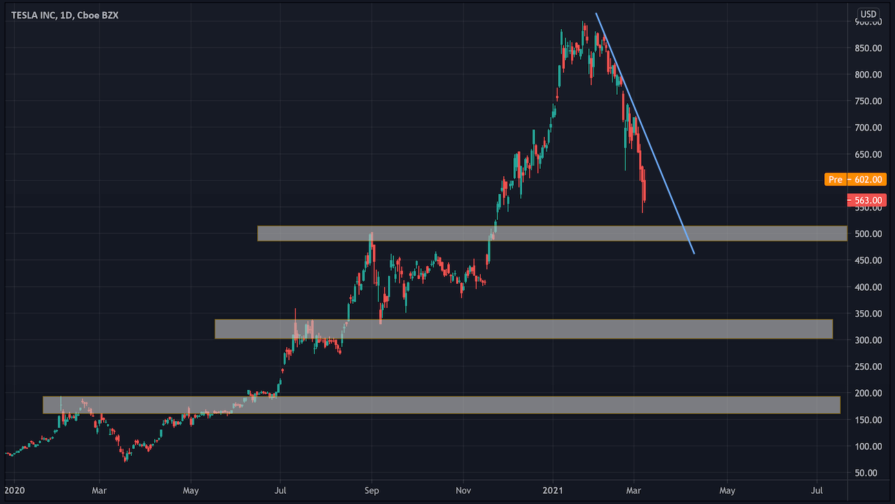 Перед Вами – график котировок акций Tesla. Если мы оценим этот график с точки зрения технического анализа, то увидим, что максимальная цена была на уровне $900 за одну акцию. Однако еще в марте 2020 года стоимость была на уровне $70, тогда весь фондовый рынок обрушился. Сейчас наблюдается сильная коррекция и ждать очередной отскок вверх можно от уровня $500 и $320. Все же есть риски и более серьезного падения актива. Рассматривать же покупки стоит, к примеру, только с пробоем линии нисходящего тренда.