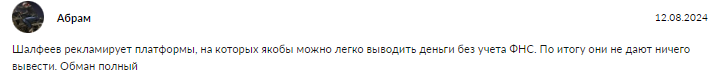 Шалфеев этот обманщик! Говорил научит зарабатывать а сам в минус уводит. Статистику не показывает проекты мутные пиарит. Деньги потерял изза него. Не ведитесь лохотрон!