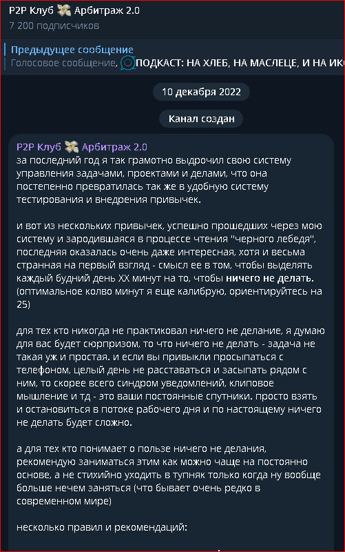 Инвестор Алексей Шалфеев ведёт свою основную деятельность в Telegram “P2P Клуб Арбитраж 2 0”. Основал свой канал он 10 декабря 2022 г. На данный момент его аудитория составляет 7200 человек. В приветственном посте инвестор начал рассказывать людям про свои привычки, и основную из них он выделил как «ничего не делать», то есть трейдер предлагает людям выделять время каждый день на то, чтобы ничем не заниматься. Есть люди, которых это насмешило, потому что они ничего не поняли.