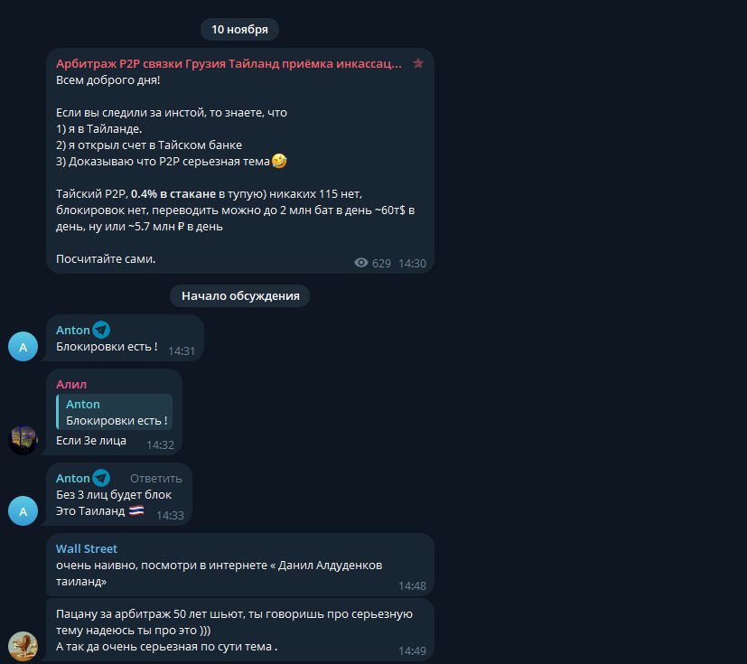 Его блог называется «Арбитраж P2P связки Грузия Тайланд приёмка инкассация криптовалюта бинанс гарантекс берибит Bybit». Канал был создан еще в два года назад, однако первый пост, который сейчас размещен в блоге, датирован 11 августа 2023. Номер этого сообщения — 10.
