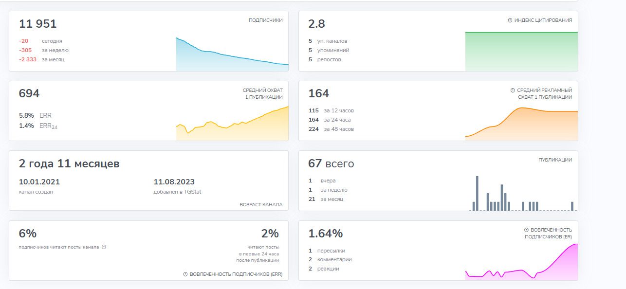 Сейчас на канал подписано почти 12 000 человек. Было и больше. Например, в августе 2023 года число подписчиков было выше 20 000 человек. С тех пор наблюдается тренд к уменьшению аудитории. Только за этот месяц от канала отписалось более 2 000 пользователей. Охваты публикаций — 6%. Все это говорит нам о том, что на канале использовалась накрутка. Есть вероятность, что блогер приобрел этот блог с уже накрученными подписчиками.
