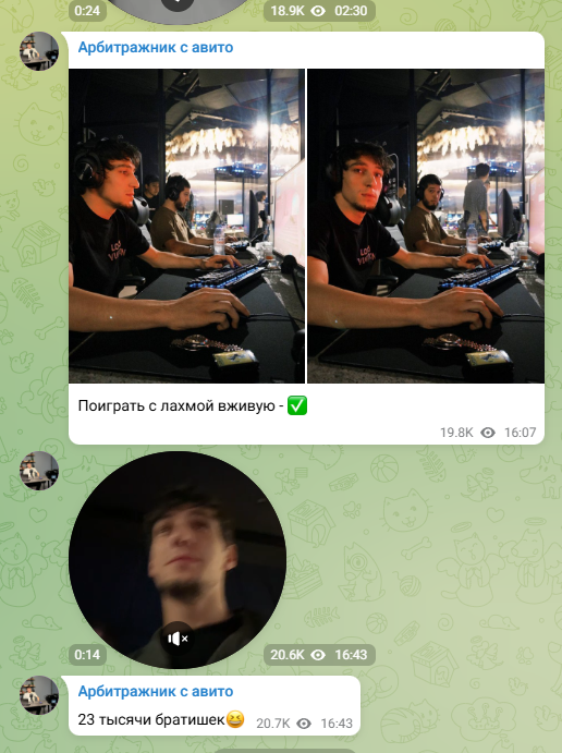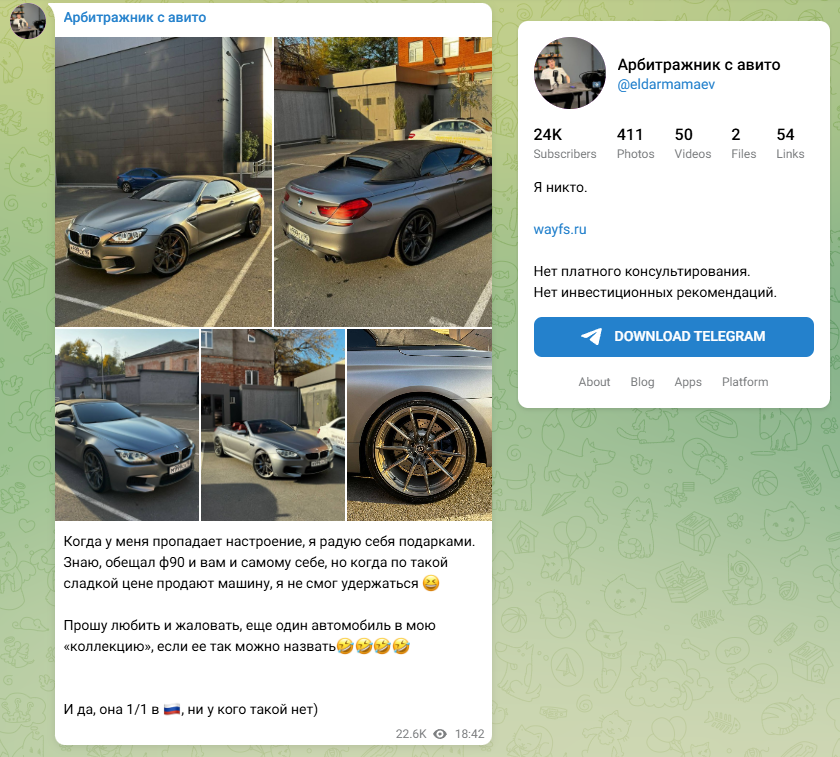 Эльдар Мамаев — молодой человек, утверждающий, что сделал состояние на арбитраже криптовалют. Автор ведет Телеграмм канал Арбитражник с Авито с аудиторией 24 000 человек. Сообщество создано в марте 2023 года и имеет невероятную статистику: более 70% читает посты, вовлеченность превышает 10% — редкий показатель. На самом деле активность накручена. Некоторые посты набирают 25-30 тысяч просмотров, хотя в тот момент на канале не было даже 15 тысяч подписчиков. Количество комментариев и репостов не так велико, но общий показатель высок за счет периодических накруток некоторых публикаций. Об авторе известно, что он родом из Махачкалы, сейчас работает на два города, приезжая в Москву к ученикам и в поисках дропов.
