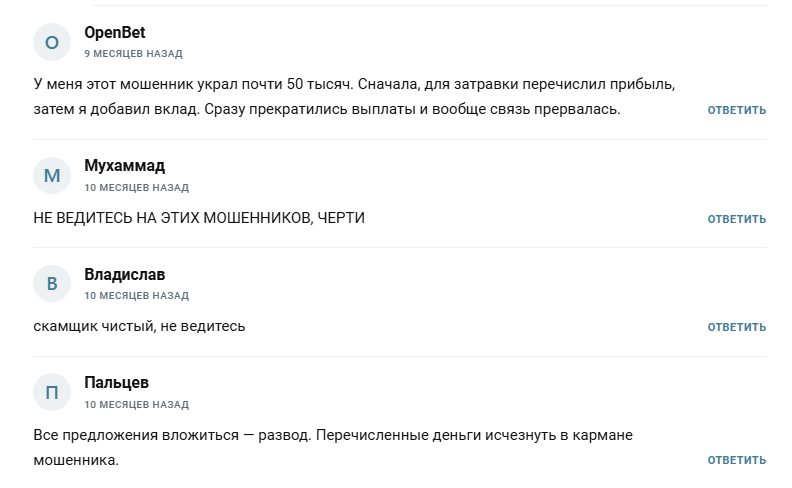 Об Эльдархане Мамаеве отзывов в сети нет, зато можно найти негативные комментарии в его канале. Пользователи пишут, что трейдер не зря рекламирует связку с Грузией, потому что в этом заключается схема обмана подписчиков. Эльдар говорит, что его человек в Грузии оформит счет клиенту, на который нужно закинуть стартовую сумму, а дальше команда будет крутить связку по своим дропам. После получения прибыли подписчик должен будет отблагодарить наставника процентом. Однако после внесения средств на грузинский счет Эльдархан перестает выходить на связь.