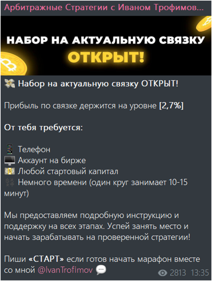 Работать подписчики канала могут на любых удобных биржах. Автор обещает спред в размере 5,5% за круг, который можно реализовать со стартовым вложением в 200 долларов. Такая прибыльность считается слишком высокой относительно рынка. Обычно показатель не превышает 1%.