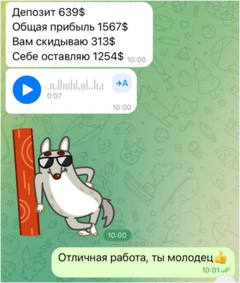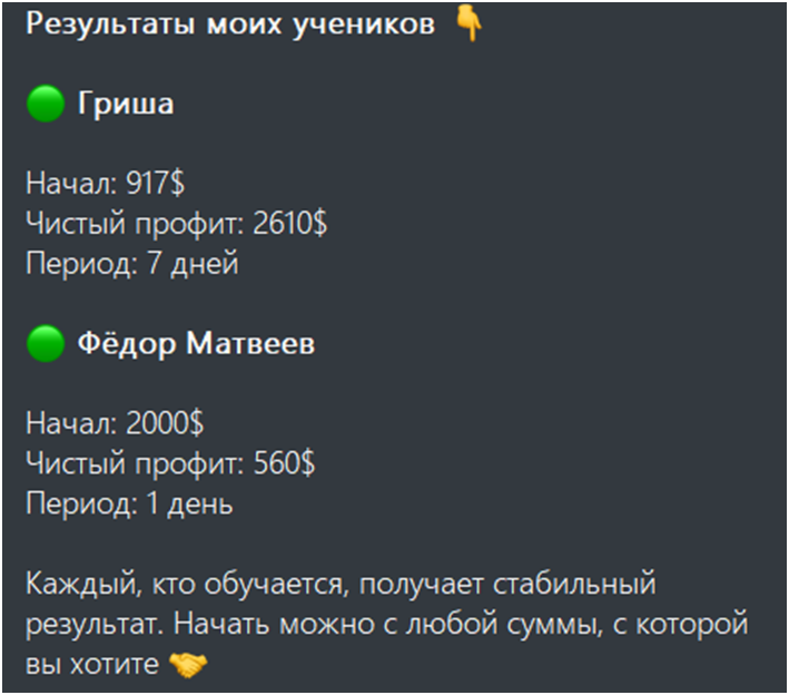 Трейдер Иван Трофимов нередко говорит о том, что в течение нескольких часов или дней работал с определенными клиентами. В постах в тг Иван делится результатами торговли своих учеников. Большинство из них начинает торговать с депозитами в районе 1-2 тыс. долларов.