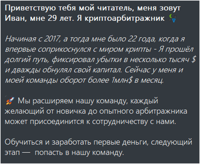 Автор блога повествует пользователям об особенностях заработка на арбитраже. Инвестор активно следит за разными монетами на биржах и зарабатывает за счет их разницы в стоимости. О себе он решил ничего не рассказывать. В одном из постов трейдер Иван Трофимов сообщил, что начал работать с криптой с 2017 года.
