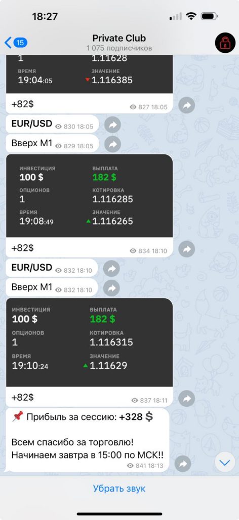 Ежедневно в канале проходит две торговые сессии (дневная и вечерняя). Каждая длится до 2 часов, за которые выходит 10-15 сигналов. Рабочий процесс выглядит вот так: