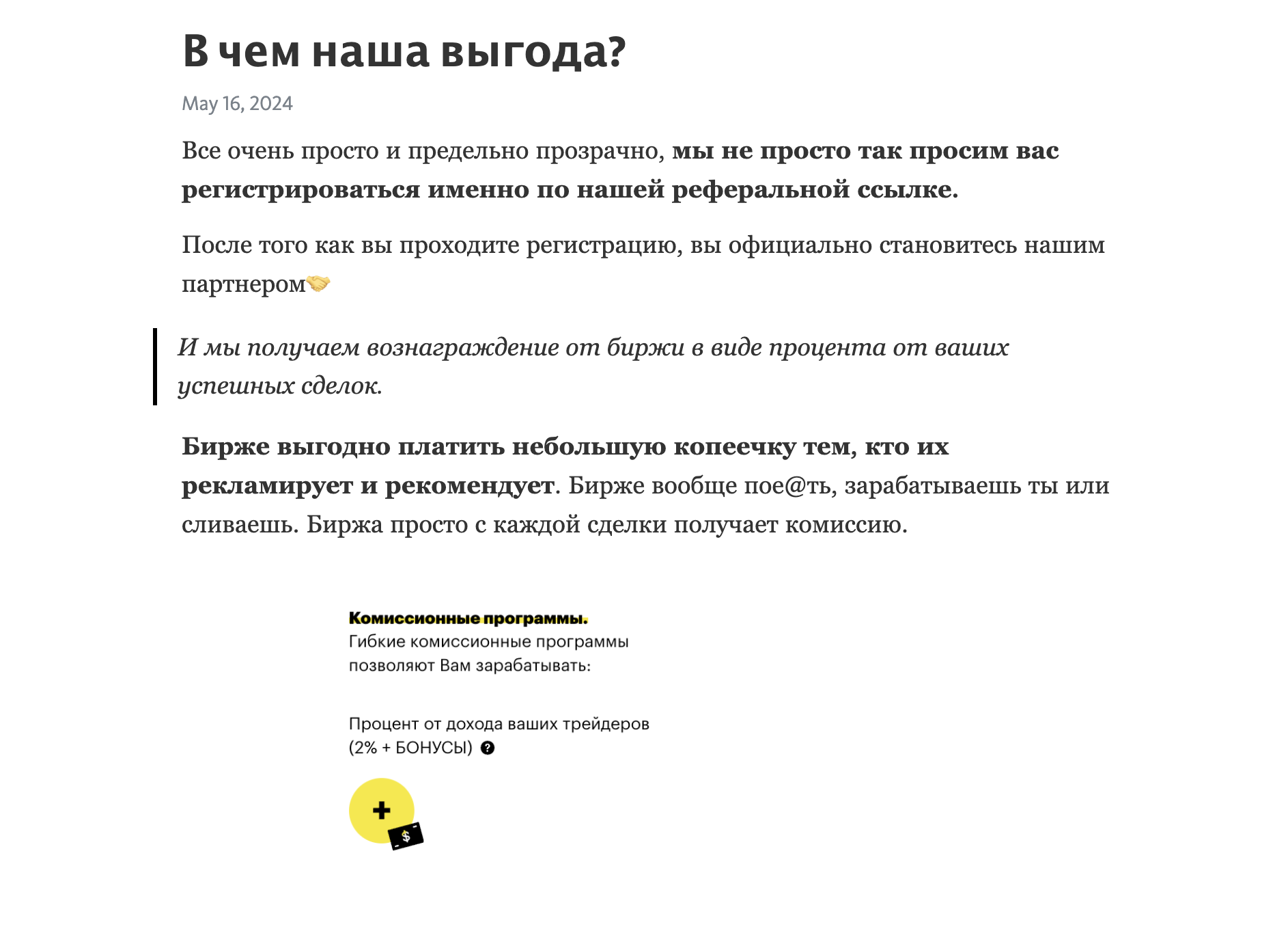 Ну ты же видишь, что доступ в канал бесплатный, по этому ему тоже нужно как-то это монетизировать. Он получает прибыль с чистой прибыли людей, которые зарегистрировались по его ссылке, то есть чем больше заработают подписчики – тем больше и он