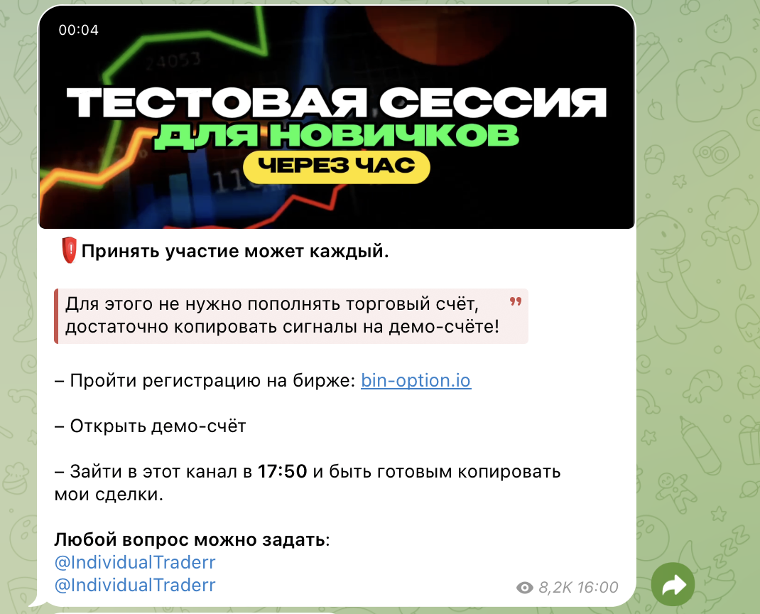 Два раза в неделю трейдер проводит тестовые сессии в основном тг-канале. Для того, чтобы новички могли пощупали опционы еще до начала сотрудничества. Каждому предлагается открыть демо-счет и попробовать свои силы на бесплатной основе.
