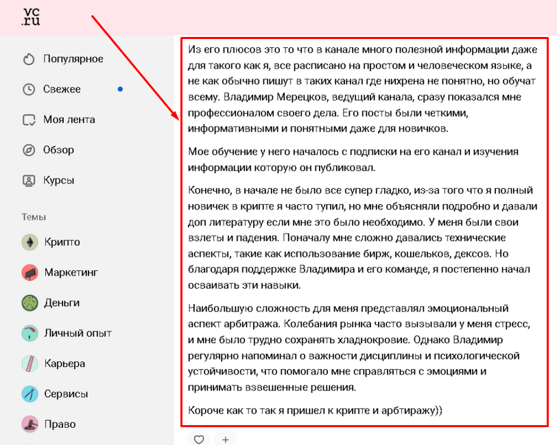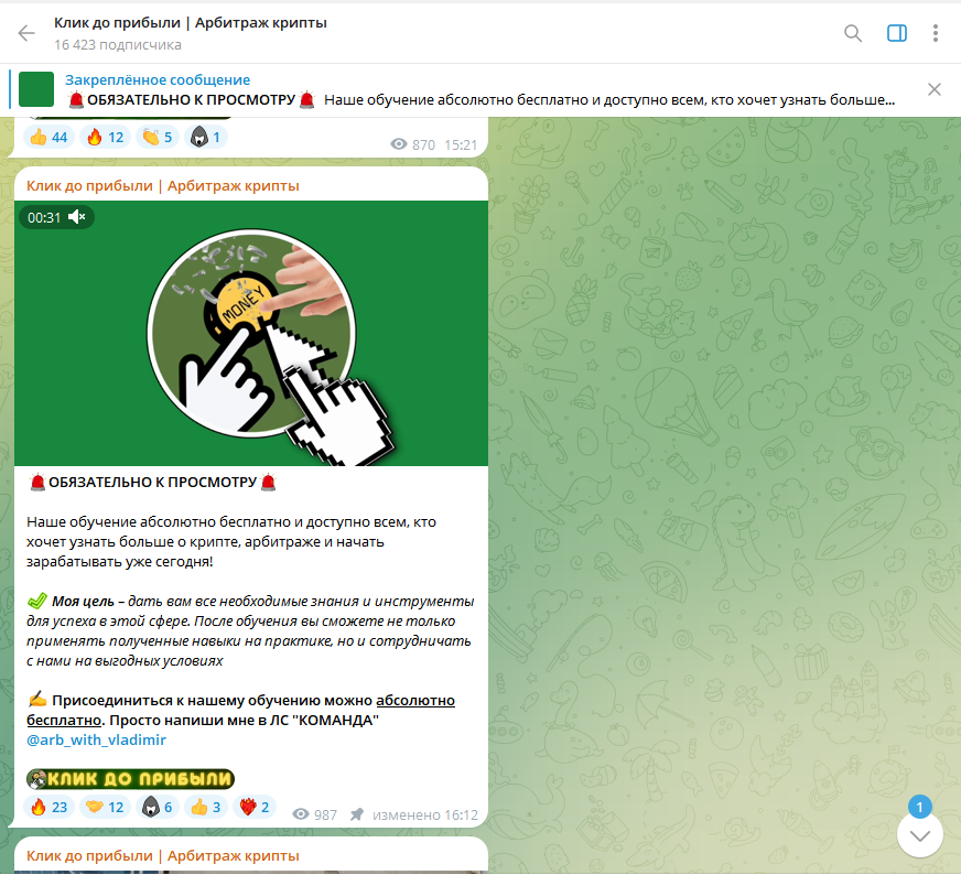 Автор канала Владимир Мерецков утверждает, что его цель состоит в формировании мощного сообщества, которое будет зарабатывать путем арбитража крипто. В подтверждение этих слов даже предоставляется бесплатное обучение. Для тех, кто его пройдет и покажет свое намерение работать серьезно, есть закрытый телеграмм-канал. Кто подумал, что он платный, ошибся.
