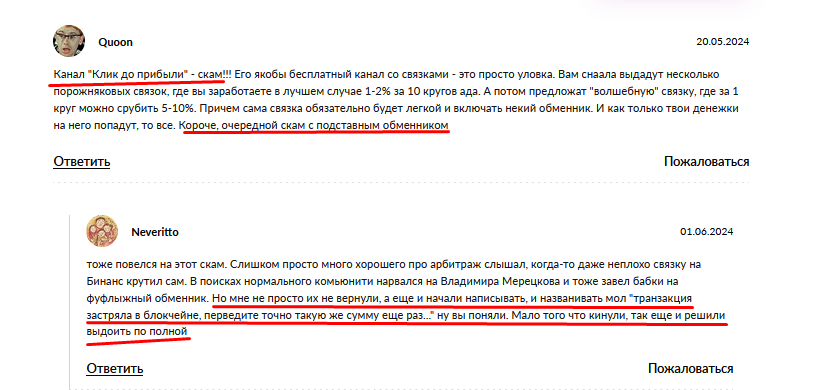 - негативные отзывы о «Клик до прибыли» выглядят очень тревожно, сообщая о наличии серьезных рисков.