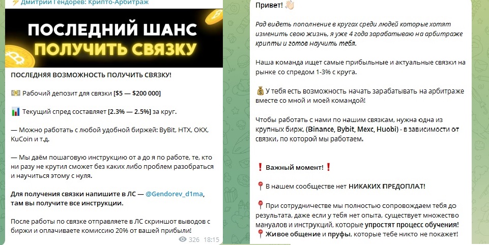 Дмитрий Гендорев — владелец канала в Телеграм для заработка на арбитражных связках. Он предлагает подписчикам прокручивать его схемы и гарантирует доход 2-3% на каждом круге. Можно ли доверять этому гуру и что говорят о проекте Дмитрий Гендорев Крипто Арбитраж отзывы клиентов, узнаем из обзора.