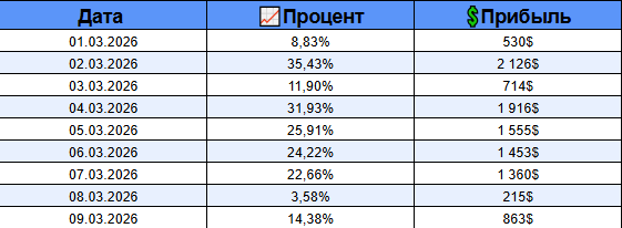 Да работу продалжаем работу. Если усреднить результат за месяц, то отклонения больше 10% от обещанаго не наблюдаем. За последние пол года один раз сумма прибыли была меньше заявленного на 8%, но на фоне всего что происходит, считаем это допустимым