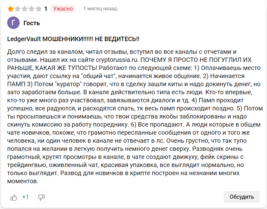 В интернете нет другой информации о телеграм-канале. Автор сообщества выкладывает положительные отзывы на LedgerVault, но не подтверждает их.