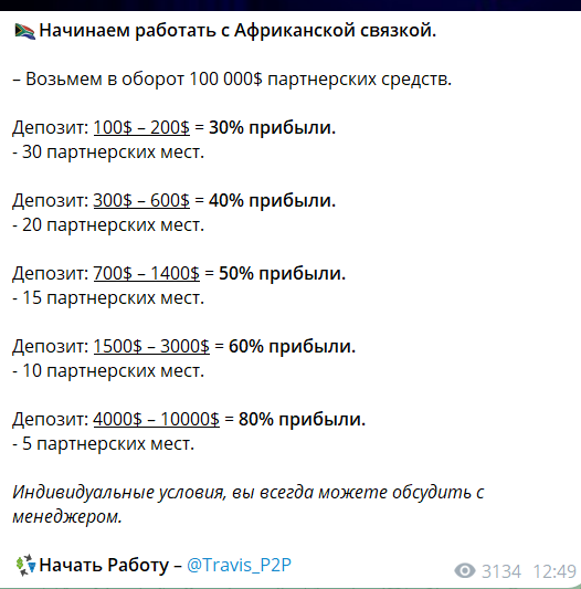 Пользователям предлагают разные связки для заработка на арбитраже криптовалют. При депозите 100-200 долларов автор обещает перевести 30% от прибыли, если пользователь внесёт 300-400 долларов, то получит 40% от прибыли и т.д. Подробную информацию можно посмотреть на изображении ниже.По данным из поста выше, можно сделать вывод, что трейдер зарабатывает процент от дохода клиентов. Чем выше был депозит, тем меньшую комиссию забирает автор. Например, при депозите 40 000-10 000 долларов, клиенту возвращают 80%. @Travis_P2P оставляет 20% себе.