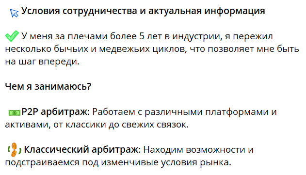 В закрепленном посте Дмитрий рассказывает о себе и схеме работы. В двух словах: автор предлагает рабочие связки, по которым можно получать до 5%. Для новичков есть инструкции о том, как купить крипту через обменники или биржу. Чтобы получить рабочую связку, нужно обращаться в личку к Дмитрию (@p2p_VoIkov).