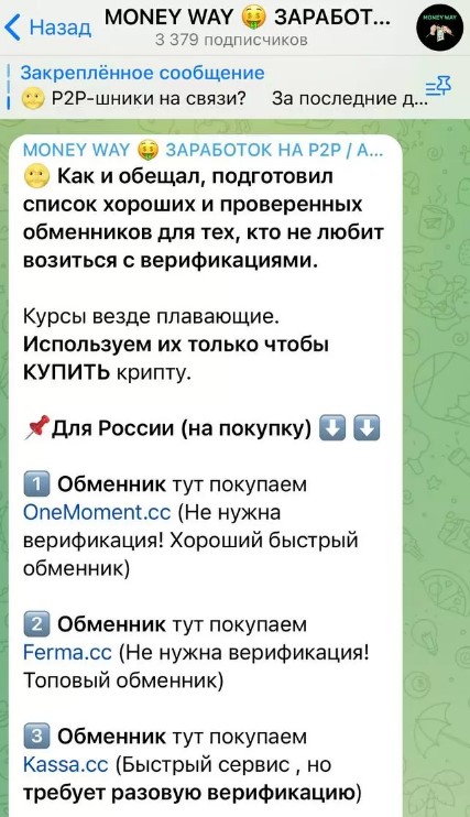 Money Way — проект в Telegram под руководством трейдера Максима Самсонова, предназначенный для трейдеров, которые торгуют криптовалютами. Участникам канала обещается достаточно большой процент прибыли от арбитражных операций, но не на биржах, а используя децентрализованную схему обмена валют p2p. Сама такая торговля связана с высокими рисками, но в данном случае есть еще и другие подводные камни.