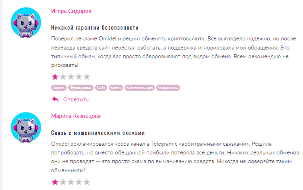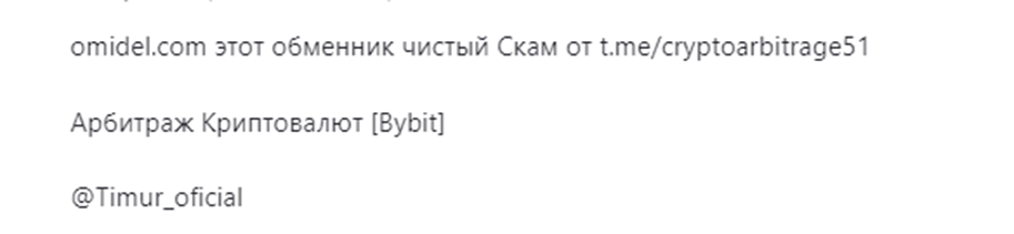 В отзывах о Omidel арбитражники жалуются, что связка, предложенная телеграм-каналом «Арбитраж Криптовалют [Bybit]» не работает. Деньги зависают в обменнике на неопределенное время без возможности отмены сделки.