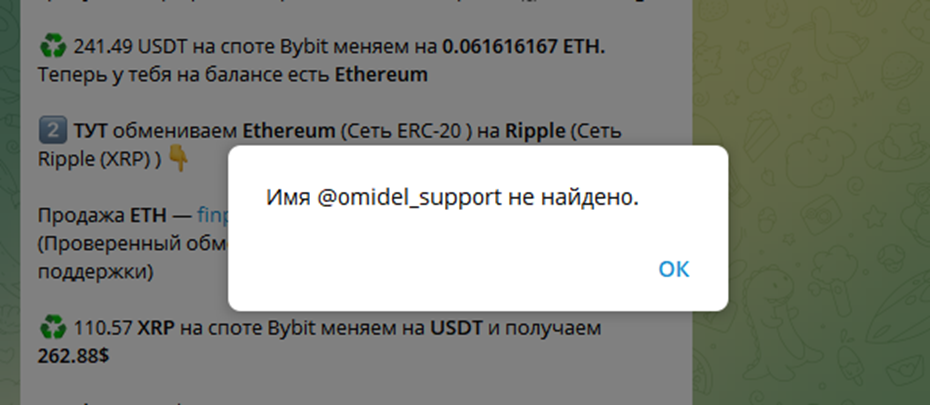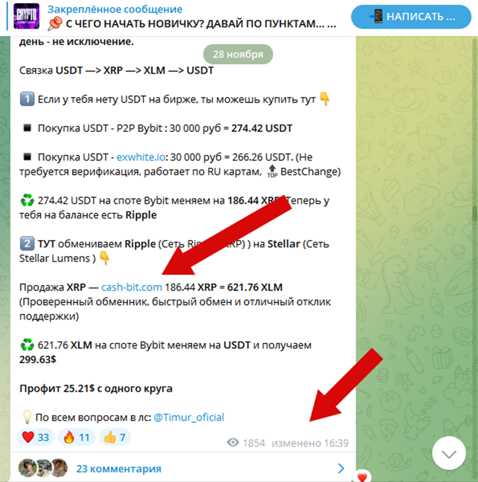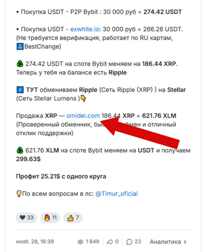 Omidel приобрел клиентов сразу после создания, когда на скам-канале «Арбитраж Криптовалют [Bybit]» появилась реклама рабочей арбитражной связки, завершающим элементом которой и был данный крипто-пункт. Если зайти в это сообщество сейчас, пост от 28 ноября 2024 года вряд ли вызовет подозрения в разводе, и он никак не связан с «Омидел Ком». Сверху есть сообщение, что связка неактивна, больше ей нельзя воспользоваться. Однако, в статусе поста можно заметить, что он был изменен.