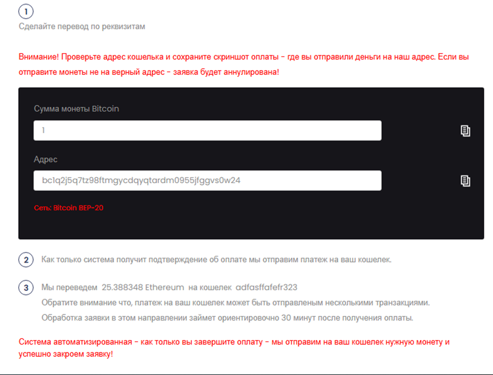 После создания заявки система выдаст кошелек, куда следует отправить указанную сумму денег. При успешном подтверждении перевода пользователю должна поступить запрошенная крипта. На обработку транзакции требуется около 30 минут.