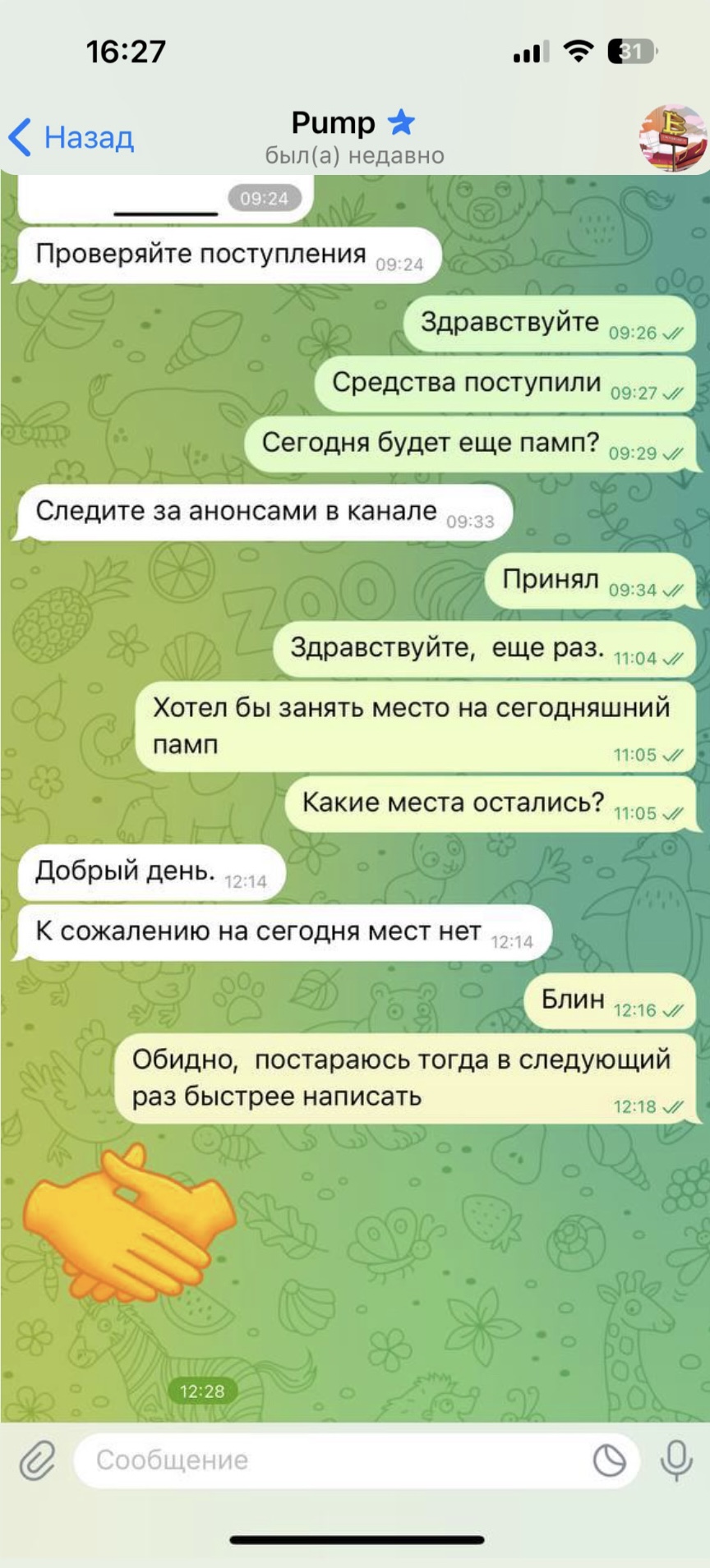 Но если на следующий день памп будет производиться на той же бирже, вам скажут что мест нет) Мы сначале в это не верили, но потом решили проверить лично: