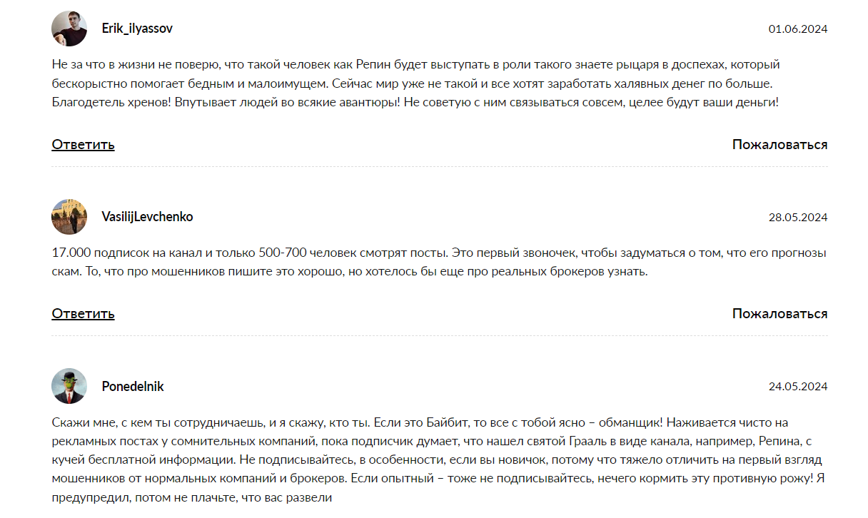 Многие пользователи негативно высказываются о сотрудничестве Андрея Репина с биржами-обманщиками. К его рекомендациям относятся скептически. Также в сети мы обнаружили большое количество обзоров от известных трейдеров об Андрее Репине. Все они говорят о том, что он ведет мошенническую деятельность. Довольных и положительных мнений о проекте нет.
