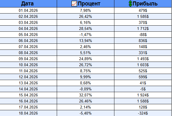 Да работу продалжаем работу. Если усреднить результат за месяц, то отклонения больше 10% от обещанаго не наблюдаем. За последние пол года один раз сумма прибыли была меньше заявленного на 8%, но на фоне всего что происходит, считаем это допустимым