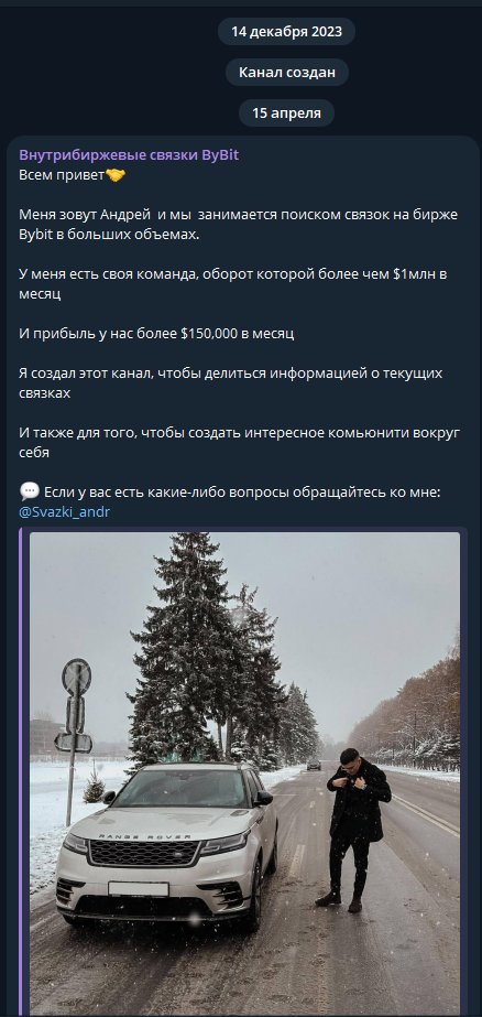 Официальный телеграм-канал проекта — vnutribirzhevye svyazki bybit. Дата создания — 14 декабря 2023 года. Первый пост появился только 15 апреля.