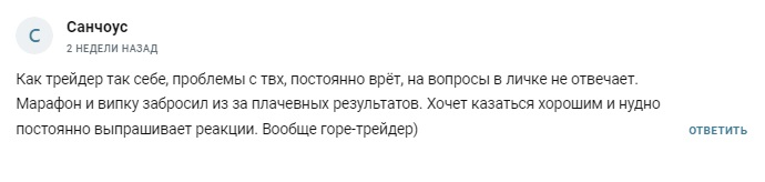 Пользователи пишут, что результат работы по сигналам трейдера нулевой. Они не смогли заработать деньги на сделках, о которых писали на телеграмм-канале «Советник Марафон».