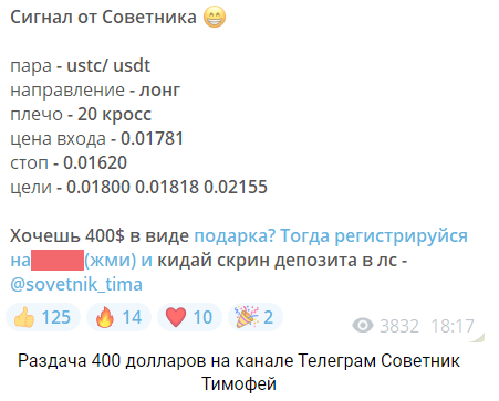 У себя в группе инвестор публикует сигналы, связанные с продажей и покупкой крипты по базовой стоимости. Он предлагает пройти на биржу по ссылке и зарегистрироваться на ней. Взамен подписчик получает подарочный счет в виде 400 долларов. Действовать нужно так, как расписал опытный Sovetnik Tima в своем сообщении.