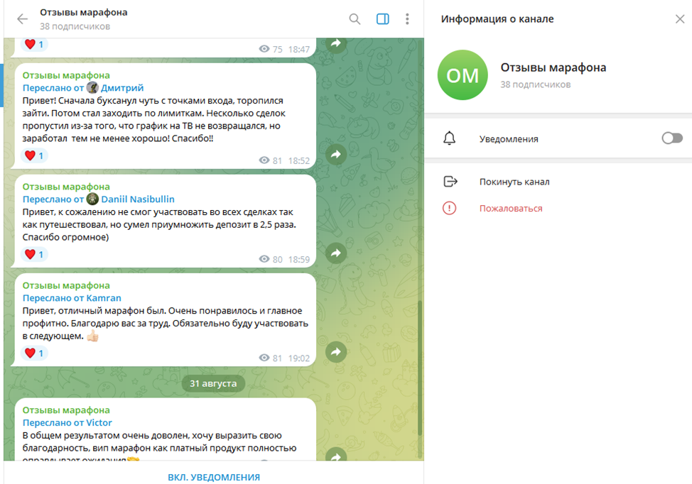 В основной ленте телеграм-канала Yura Trade иногда появляются репосты сообщений с положительными отзывами. Обычно они содержат слова восхищения способностью трейдера видеть выгодные тенденции на криптовалютном рынке. Все положительные мнения о завершенных марафонах выкладываются в отдельный телеграм-канал «Отзывы марафона».