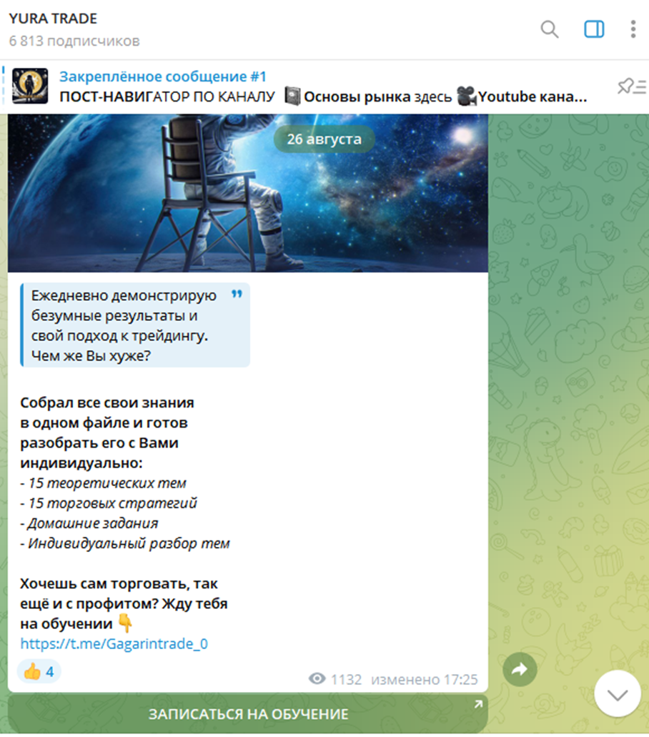Как и другие телегам-трейдеры, Юрий активно публикует посты с рекламой популярных бирж. То есть одним из источников его дохода являются реферальные ссылки.В сообщениях, размещенных в августе, инвестор приглашал всех желающих на обучение трейдингу. Авторская программа gagarin trade состояла из 15 теоретических уроков про самые популярные стратегии ведения биржевой игры. Автор обещал свою помощь при разборе тем, а также тестирование знаний после прохождения каждого блока.