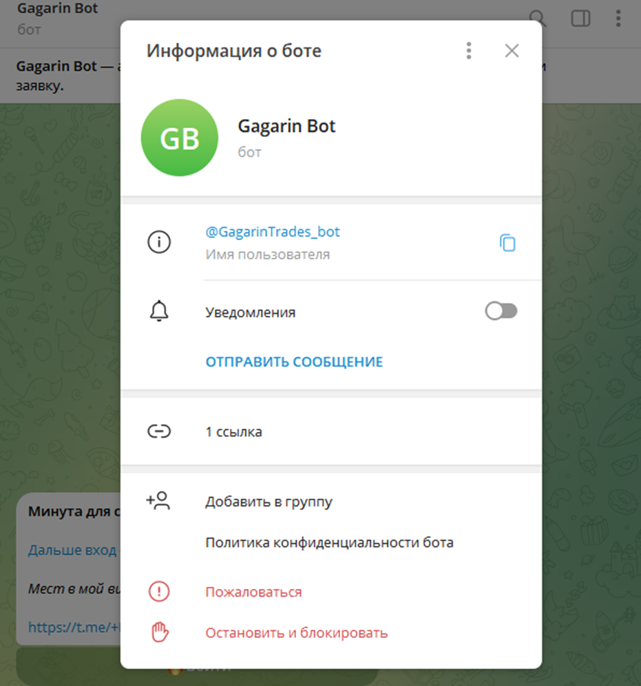 Подписка на канал возможна только после прохождения модерации. При подаче заявки в списке контактов появляется бот Gagarin Trades Bot, предлагающий подписаться на партнерские ресурсы. Такой формат подачи рекламы может негативно повлиять на количество новых подписчиков.