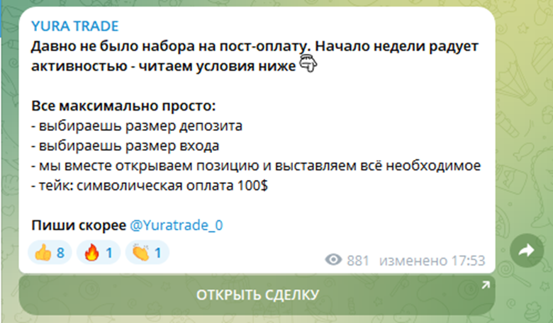 Авторский канал «Юра Трейд» предлагает бесплатные сигналы, которые публикуются несколько раз в день. Также в ленте есть посты про платные услуги от основателя сообщества. Основной платный продукт – марафон по раскрутке счета. За последний год он запусти три таких мероприятия.