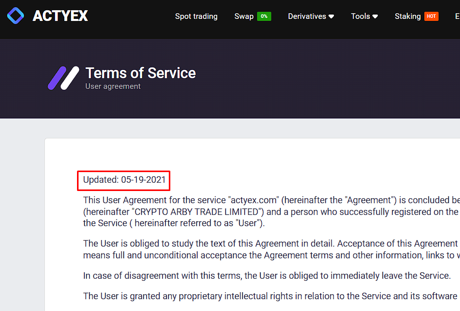 Что интересно, на сайте Actyex com есть раздел с юридическими документами, но ни одного документа в нем нет. Зато есть правила, которые якобы обновлены еще за три года до запуска самого проекта.