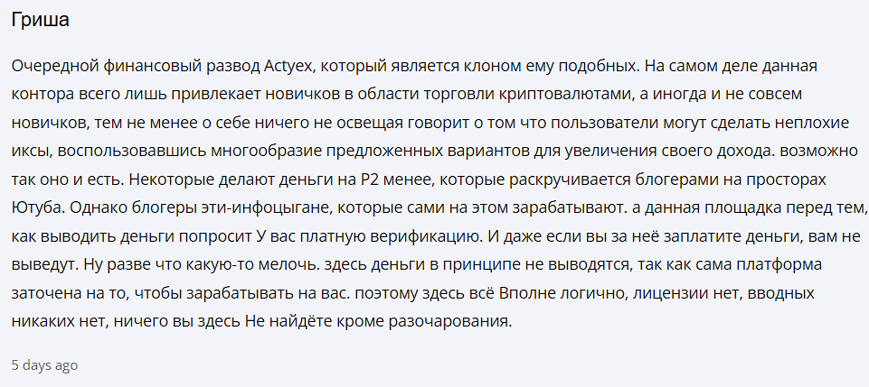 Вот только когда пользователь попытается вывести деньги, с него начнут требовать оплату несуществующих услуг. «Внезапно» окажется, что требуется и платная верификация, и уплата комиссии, и даже страховка аккаунта. В реальности аферисты из Actyex com присваивают все деньги себе.