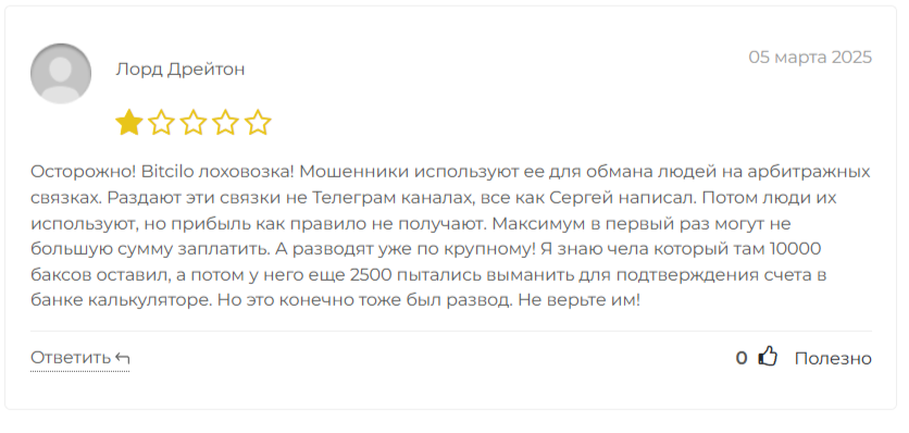 В отзывах о Биткило также указывается, что платформа разводит на арбитражных сделках. Сначала клиенту могут заплатить какую-то сумму, но в конечном итоге деньги блокируются.