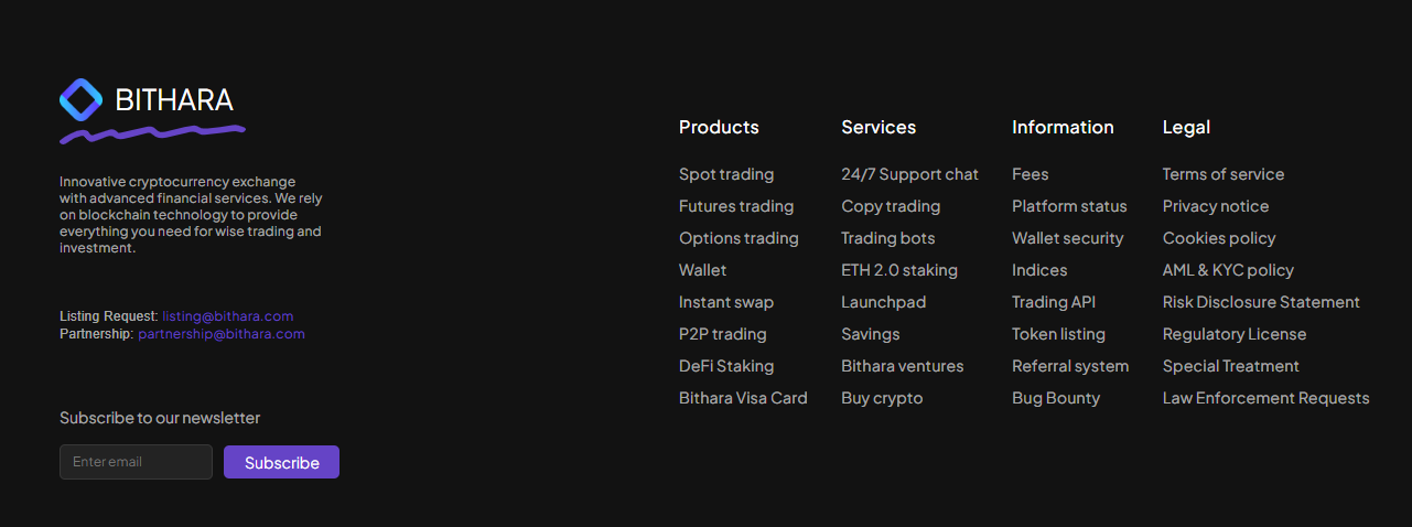 Большая часть данных и возможностей доступна только после регистрации аккаунта на сайте биржи Bithara com, в частности, это сведения о сервисах и продуктах, использование онлайн-чата службы поддержки. С сотрудниками организации можно связаться только по указанным адресам e-mail listing@bithara com и partnership@bithara com.