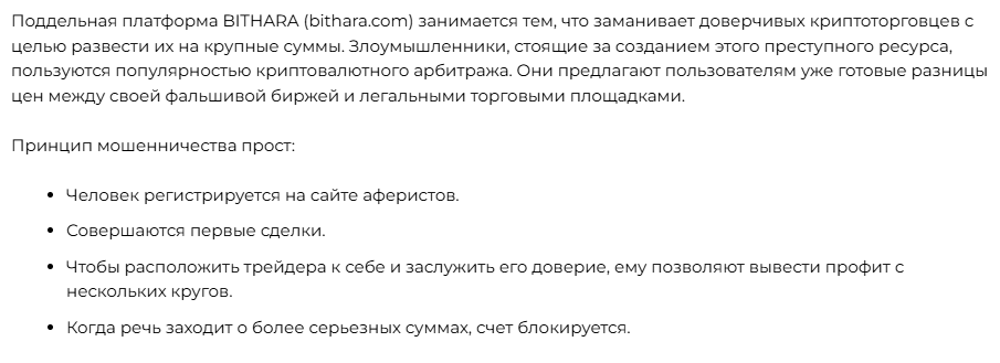 В сети отзывы о Bithara com не представлены, однако имеются правозащитные обзоры и рецензии. В них описывается схема мошеннической деятельности организации, есть информация о блокировке средств на счете и их присвоении.