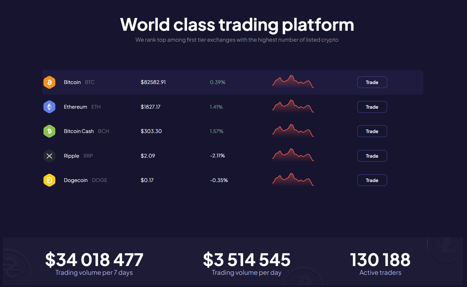 На сайте можно торговать рядом криптовалют, включая BTC, ETH и некоторые другие. На нем представлена информация о баснословных цифрах ежедневного и еженедельного оборота, количестве активных трейдеров терминала. Эти данные ничем не подтверждены и не вызывают доверия.