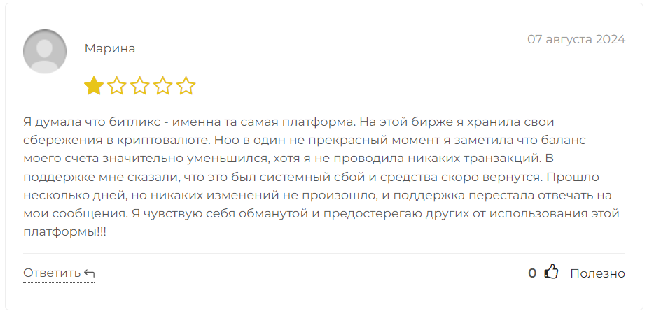 В интернете о Bitlakes встречаются негативные отзывы. Пользователь по имени Марина пожаловалась, что администрация биржи незаконно списала средства с ее баланса. Деньги обещали вернуть, но безрезультатно.