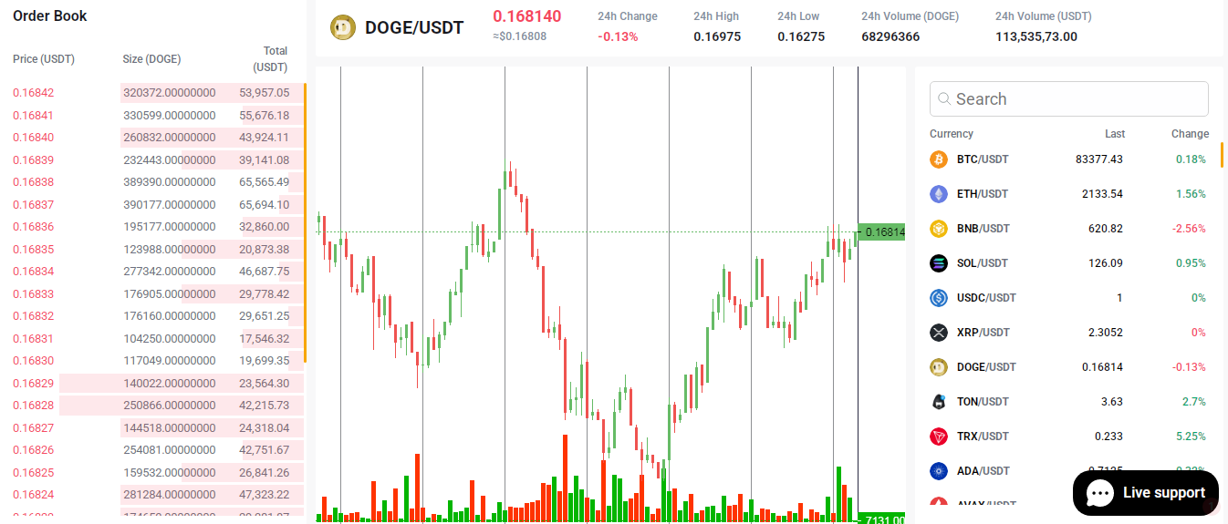 Торговый терминал очень простой. Масштаб графика изменить нельзя. Слева отображается книга ордеров, справа — выбор криптовалютных пар. На практике проанализировать с его помощью тренды и принять правильное решение о входе в рынок не получится.