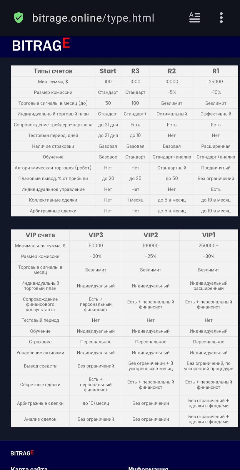 Чтобы начать торговать, нужно внести минимум $100. При этом Bitrage предлагает услуги брокера, предоставляя четыре обычных типа и три VIP счёта.