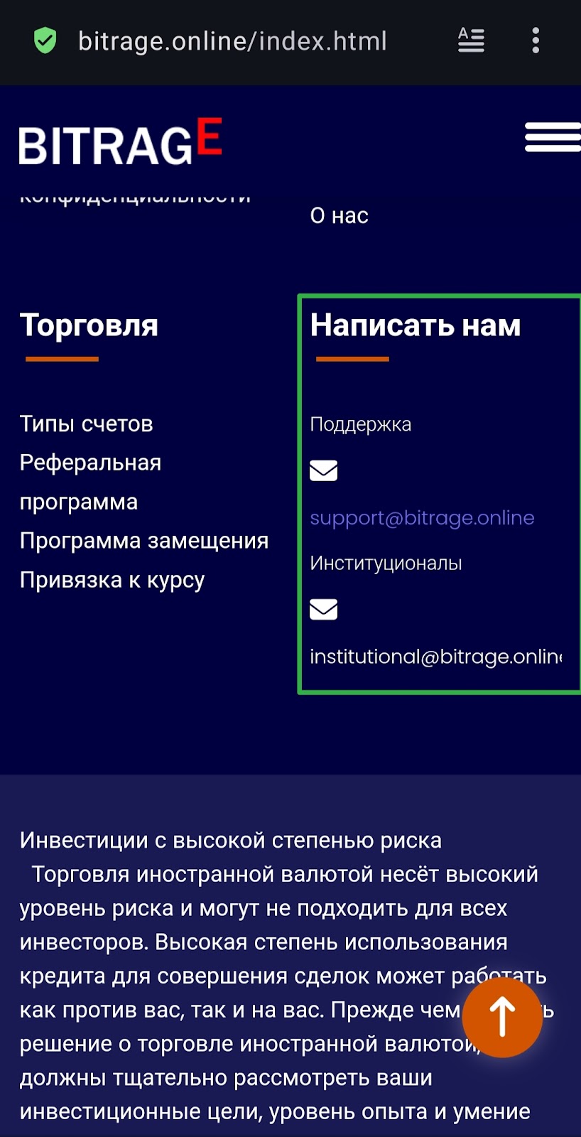 В контактах платформы нет номеров или аккаунтов в мессенджерах для поддержки участников. Указаны всего два почтовых адреса для обратной связи: support Bitrage online — для обычных пользователей, и Institutional — для «крупных клиентов».