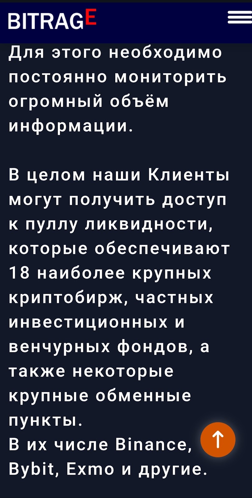 «Битраге» обещает доступ к «крупнейшему пулу ликвидности» из 18 бирж, включая известные Binance и Bybit. Тем не менее стоит знать, что это неофициальное сотрудничество — биржа просто технически подключается к их системам через API.