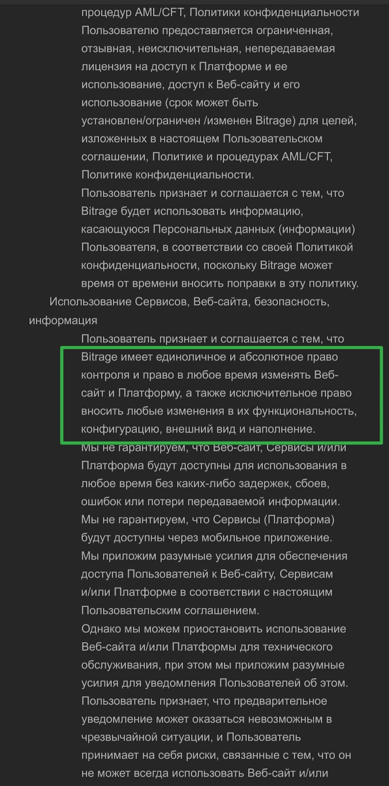 В пользовательском соглашении проект приводит несколько спорных моментов. Например, биржа может в любой момент поменять правила без предупреждения, а все услуги предоставляются без гарантий.