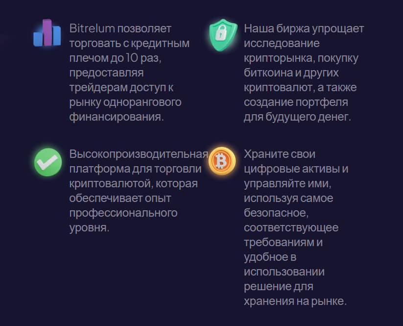 На сайте проекта пользователи могут ознакомиться с его преимуществами, а также посмотреть информацию о рабочем процессе и основных аспектах торговли с «Битрелум ком». Основными преимуществами и выгодными предложениями являются высокая производительность и бережное отношение к клиенту, торговля с кредитными плечами, а также простое исследование рынков и бирж.
