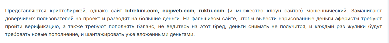 • Отзывы о бирже Bitrelum com встречаются зачастую негативные, что указывает клиентам на отсутствие реального заработка и возможный развод.